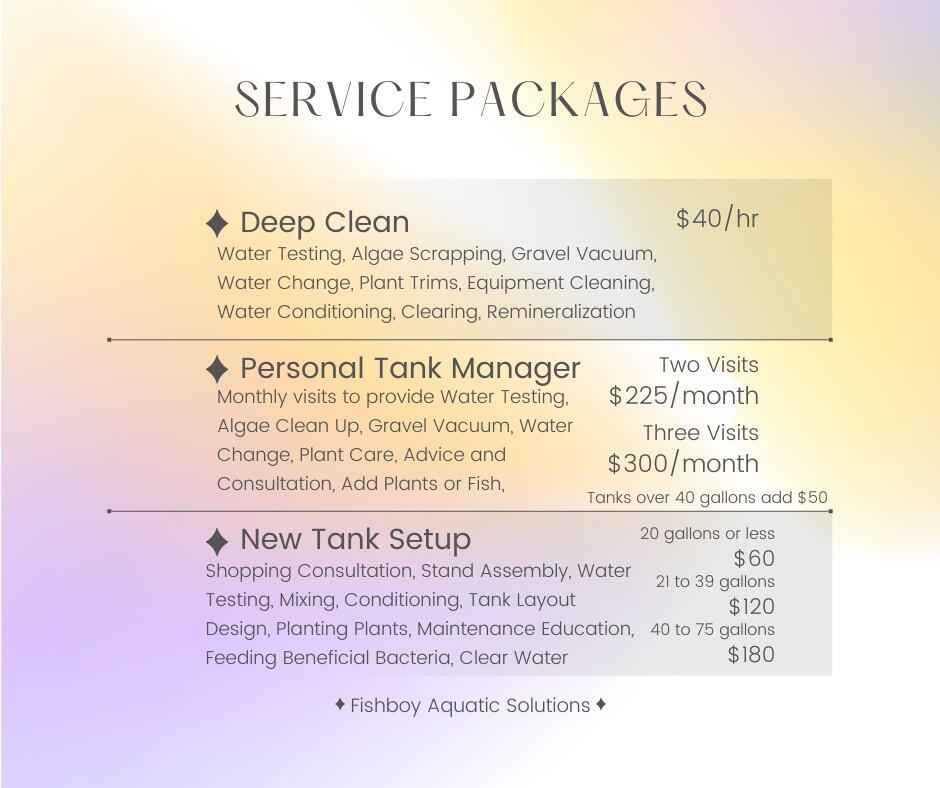 Affordable professional aquarium maintenance, tank and equipement cleaning, first time setup, and aquascaping services